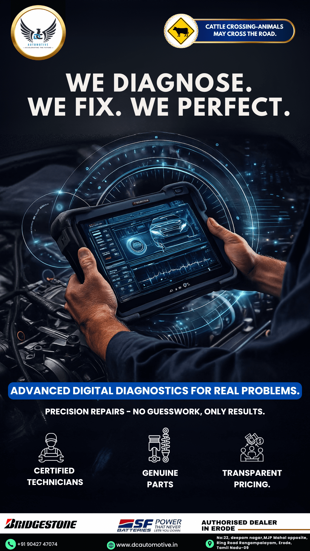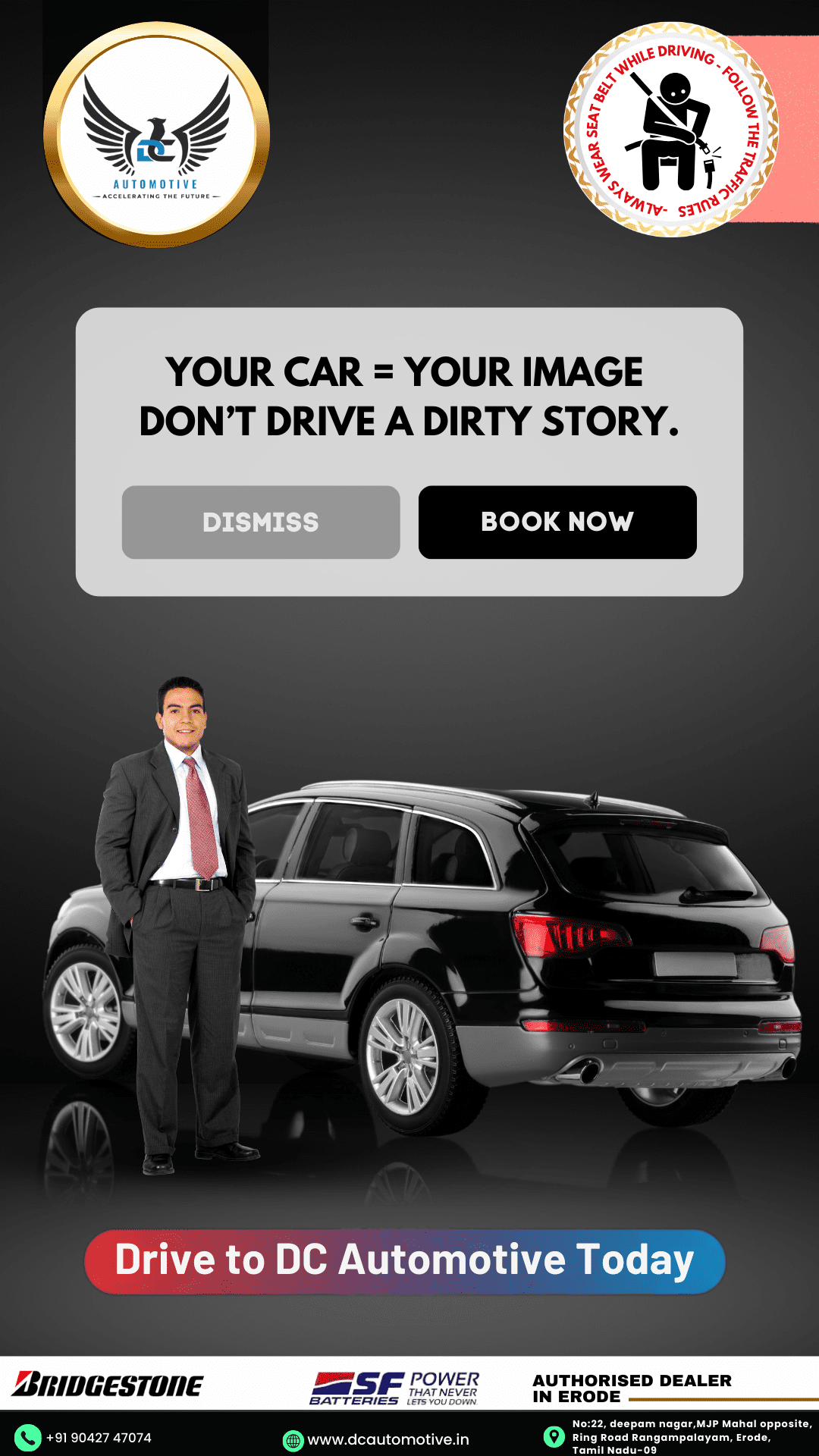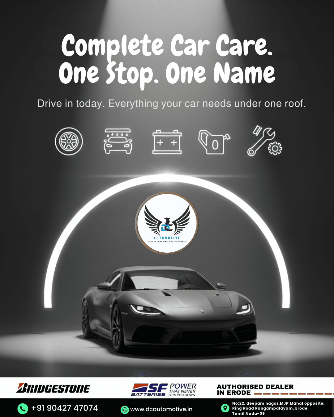 DC Automotive is Erode’s one-stop centre for car wash, mechanical service, spares, audio systems, engine oil, and Bridgestone tyres.My goal was to build strong local visibility, create high-engagement content, and turn social media into a walk-in enquiry generator.