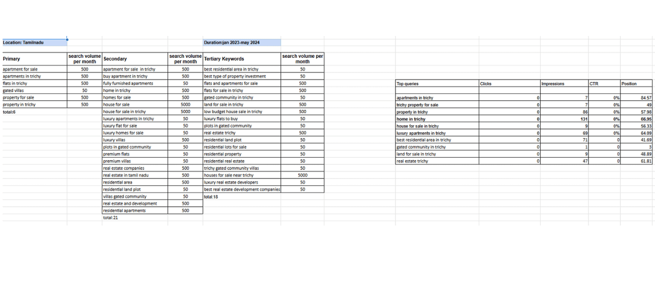 - Identified high-intent, location-based keywords such as “apartments in Trichy,” “property in Trichy,” “gated villas,” and “home in Trichy” to support sales-focused pages.