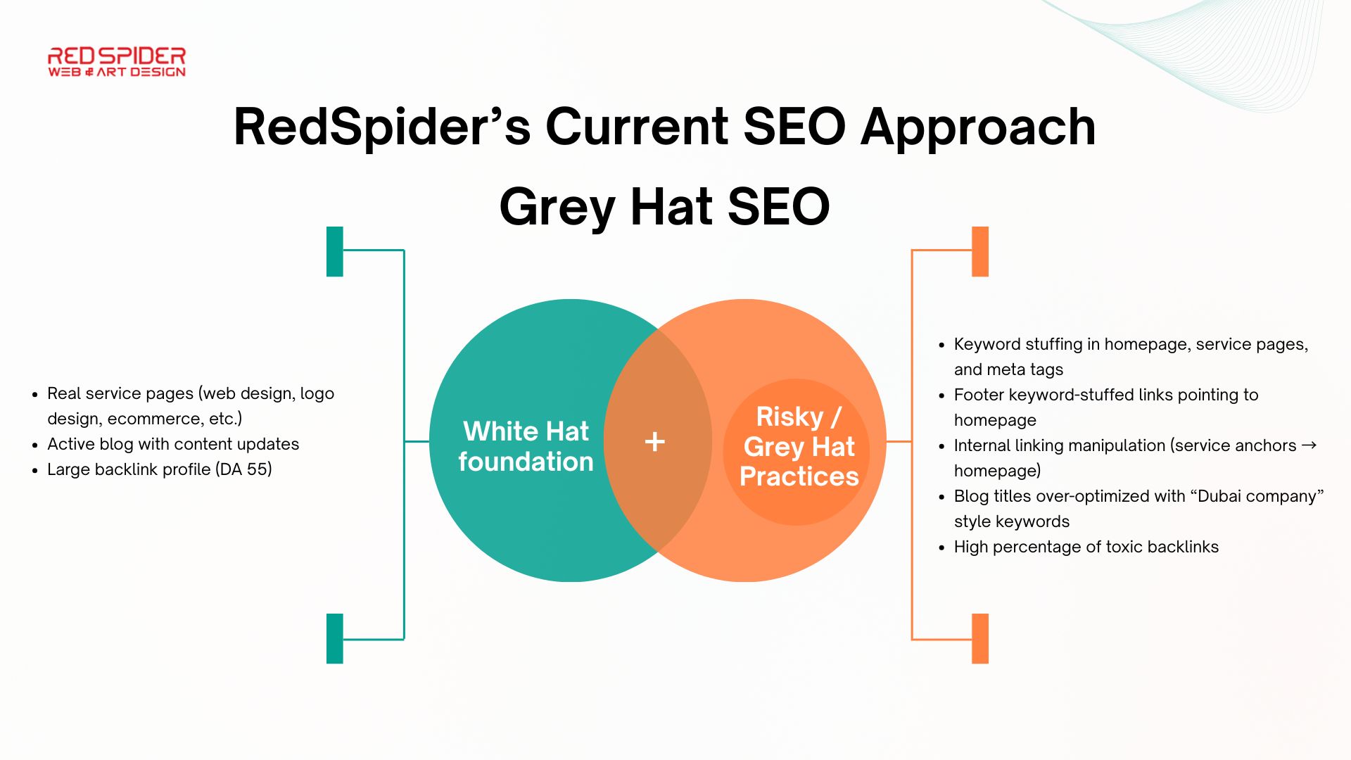 This project focuses on analysing RedSpider’s complete SEO ecosystem and restructuring it into a sustainable, high-performing search strategy. The work covers a full audit of on-page elements, technical issues, content architecture, backlink profile, keyword distribution, and user experience gaps. The goal was to identify the core reasons behind low organic visibility despite strong domain authority, and outline a practical roadmap that eliminates keyword stuffing, resolves cannibalization, strengthens topical authority, and builds a cleaner search footprint for the agency.